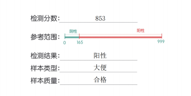 古先生按照说明书在家采样后寄回公司,拿到检测报告后发现,参考范围0-999的分数,0-165显示为阴性,165-999之间则标红提示阳性,而古先生的检测分数高达853分!